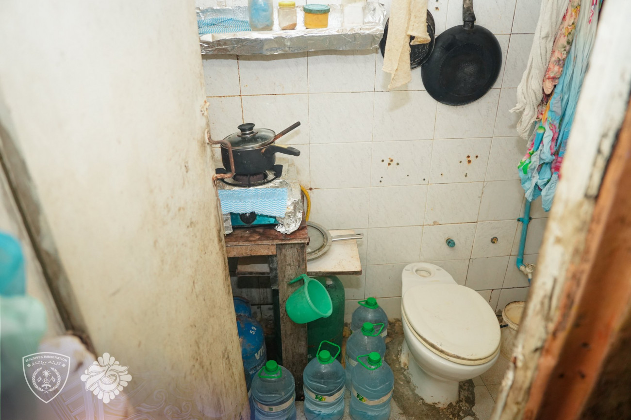 އިކޮނިމިކް މިނިސްޓްރީއާ ގުޅިގެން އިމިގްރޭޝަނުން ރޭ ހިންގި އޮޕަރޭޝަނުގައި، ފުޅާ ދާއިރާއެއްގައި ބިދޭސީންތަކެއް ކާބޯތަކެތި ތައްޔާރު ކުރަމުން ދިޔަ ތަނެއް ރެއިޑުކޮށްފައިވެ އެވެ. އިމިގްރޭޝަނުން އާންމު ކޮށްފައިވާ ފޮޓޯތަކުން ފެންނަ ގޮތުގައި ކާތަކެތި ބަންދު ކުރަމުން ދިޔައީ އެމީހުން ނިދާ ވަރަށް ކުޑަކުޑަ ކޮޓަރިއެއްގަ އެވެ.