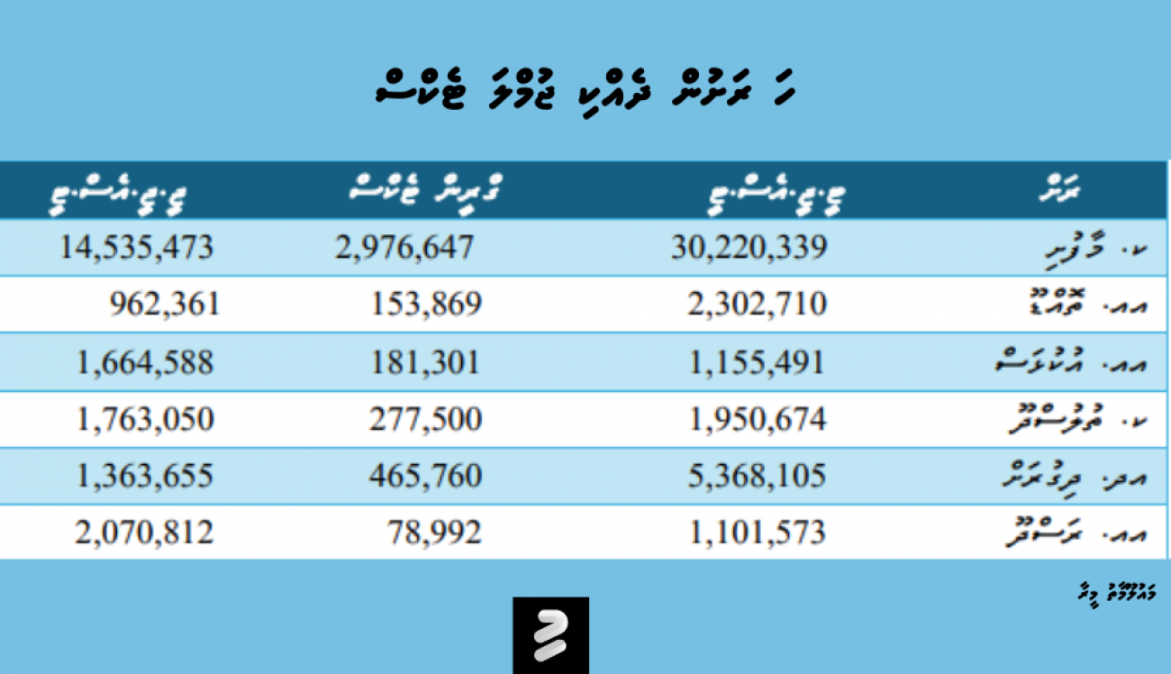 މީރާގެ މައުލޫމާތުން އެނގޭ ގޮތުގައި ރާއްޖޭގައި ގެސްޓްހައުސް އެންމެ ފުޅާ ހަ ރަށުން ދެއްކި ޖުމްލަ ޓެކްސް އުޅެނީ 20 މިލިއަން ރުފިޔާގަ އެވެ. ނަމަވެސް މާފުށީގެ އަދަދު 50 މިލިއަނުން މައްޗެވެ. ޓީޖީއެސްޓީއަށް އެކަނި 30 މިލިއަން ދެއްކި އެވެ.