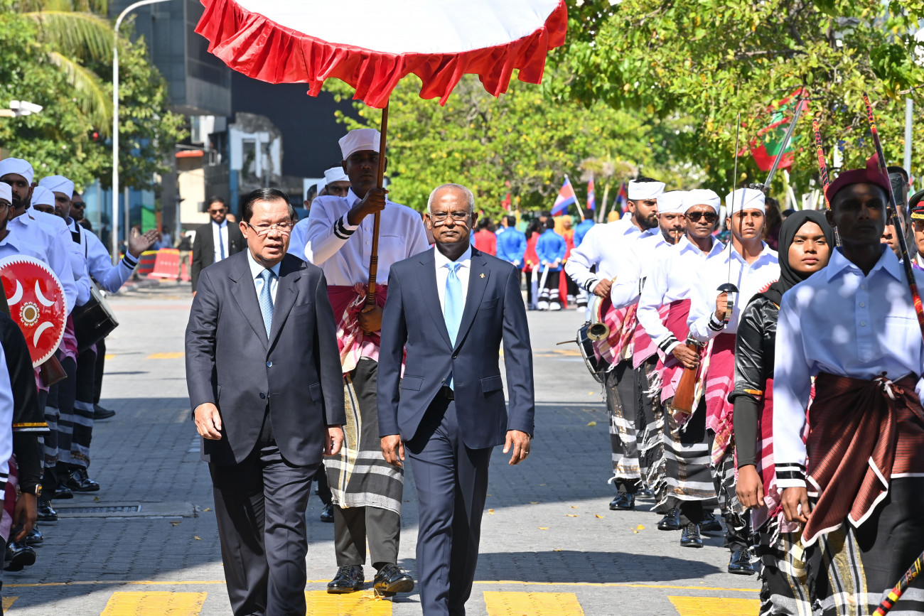 ކެމްބޯޑިއާގެ ބޮޑުވަޒީރަށް ރަސްމީ މަރުހާބާ ދެންނެވުމުގެ ގޮތުން މިއަދު ރަސްމިއްޔާތެއް ބާއްވާފައި ވަނީ ހެނދުނު ޖުމްހޫރީ މައިދާނުގަ އެވެ. ކެމްބޯޑިއާގެ ބޮޑުވަޒީރު ވެރިރަށް މާލެއަށް ފައިބާވަޑައިގަތުމާއެކު، ރަސްމީ ފާލަމުން އެމަނިކުފާނަށް މަރުހަބާ ވިދާޅުވީ ރައީސް ސޯލިހެވެ.