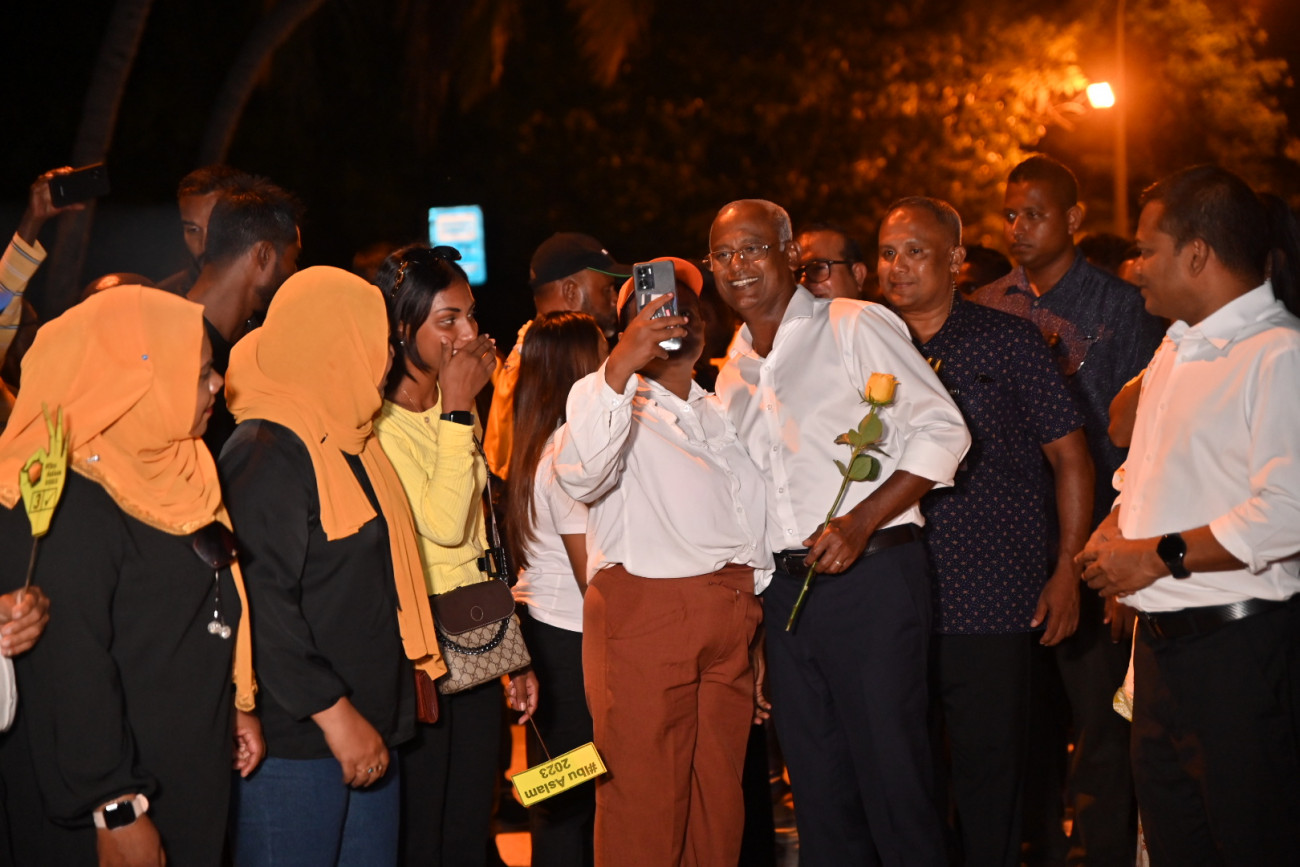 ރައީސް ވަނީ ދެ އަވަށުގައި ވާހަކަދައްކަވަމުން ވެސް އިއްޔެ އައްޑޫ ސިޓީން ކީ ހޫނު މަރުހަބާއަށް ޝުކުރު ދަންނަވާފަ އެވެ. ރައީސް ތަކުރާރުކޮށް އެދިވަޑައިގަތީ އެމަނިކުފާނަށް އިންތިހާބު އެއްބުރުން ކާމިޔާބުކޮށްދިނުމަށެވެ.
